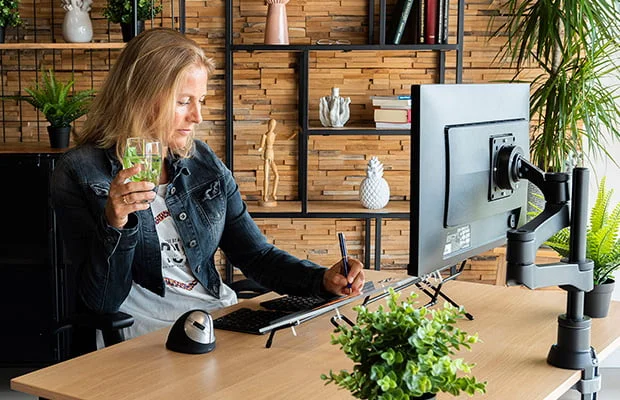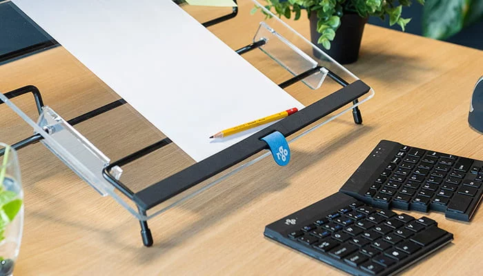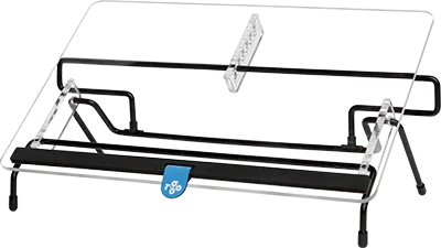 The R-Go Flex Read is an ergonomic adjustable document holder that you can also use as a writing work surface. This document holder is adjustable in 6 positions, so you automatically sit in an upright position while working. Easily set your ideal working height and angle with your left or right hand. At the front of the top is a soft foam wrist support. This allows you to write comfortably without unpleasant pressure on the wrists. The R-Go Flex Read is made in the Netherlands and has a unique design thanks to its black steel frame and transparent acrylic top.