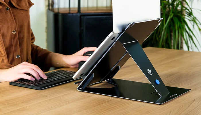 The R-Go Riser Duo laptop and tablet stand can be used to raise both your laptop and tablet. The stand is easily adjustable in height in 4 positions, so you can always work at eye level. This brings your head in a natural position and reduces tension in your neck and shoulder muscles.